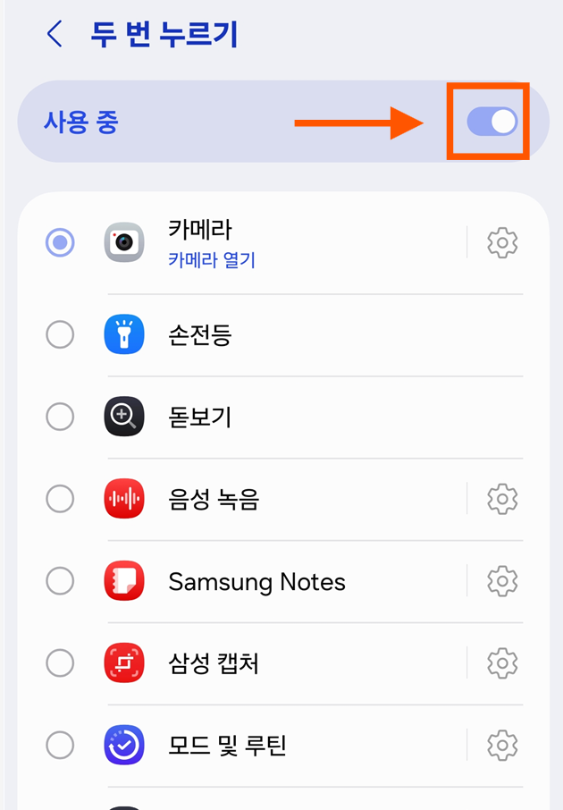 - 두 번 누르기: 기본적으로 카메라 실행으로 설정되어 있어요