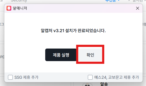 '확인' 버튼을 선택해서 설치를 마무리하세요. 설치가 완료되면 바로 알캡처를 사용할 수 있어요.